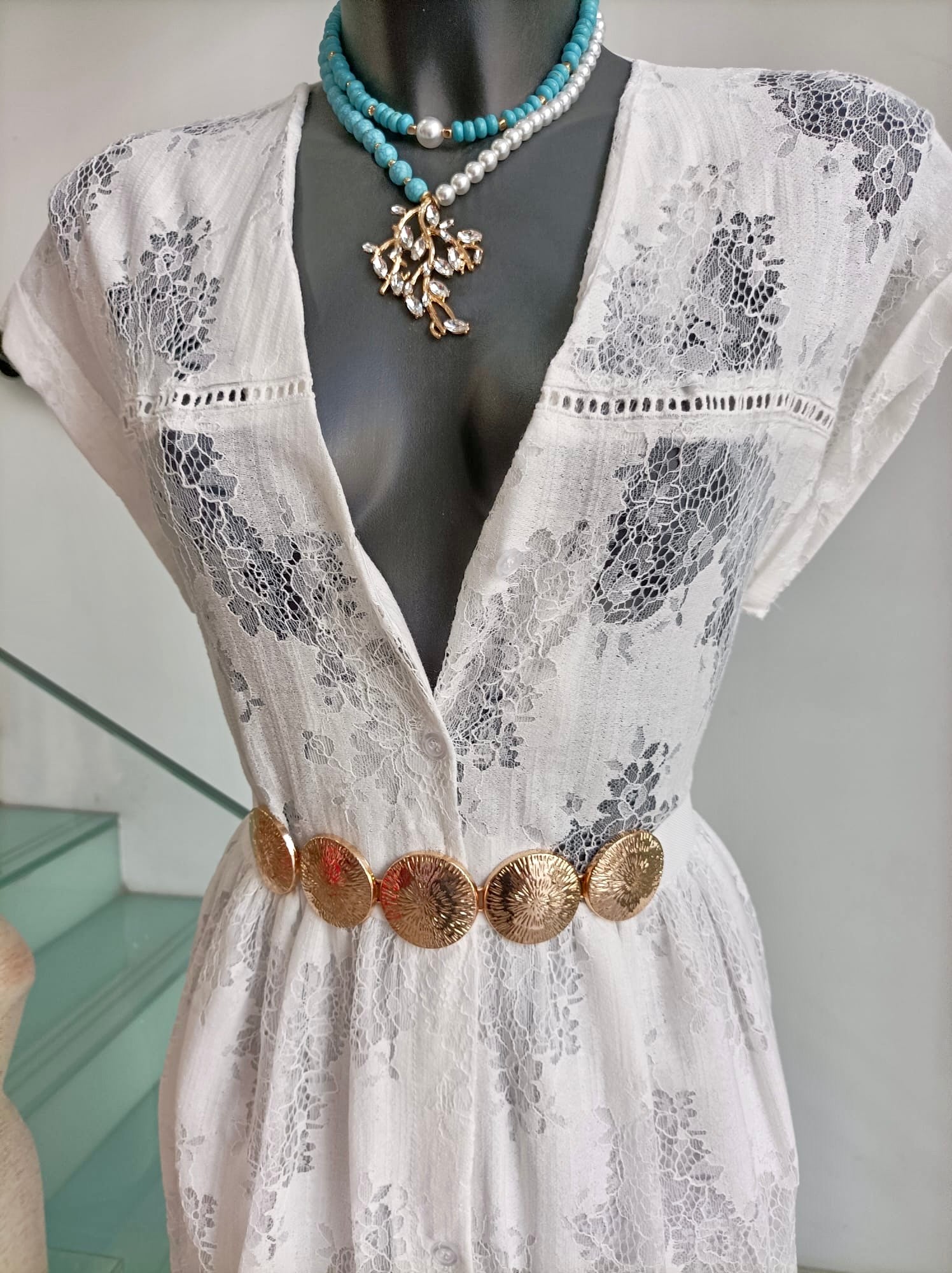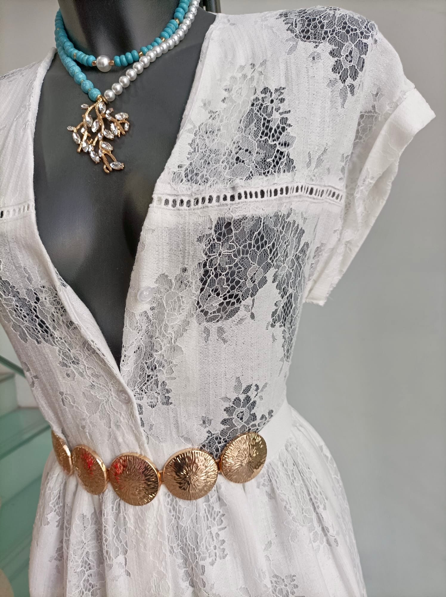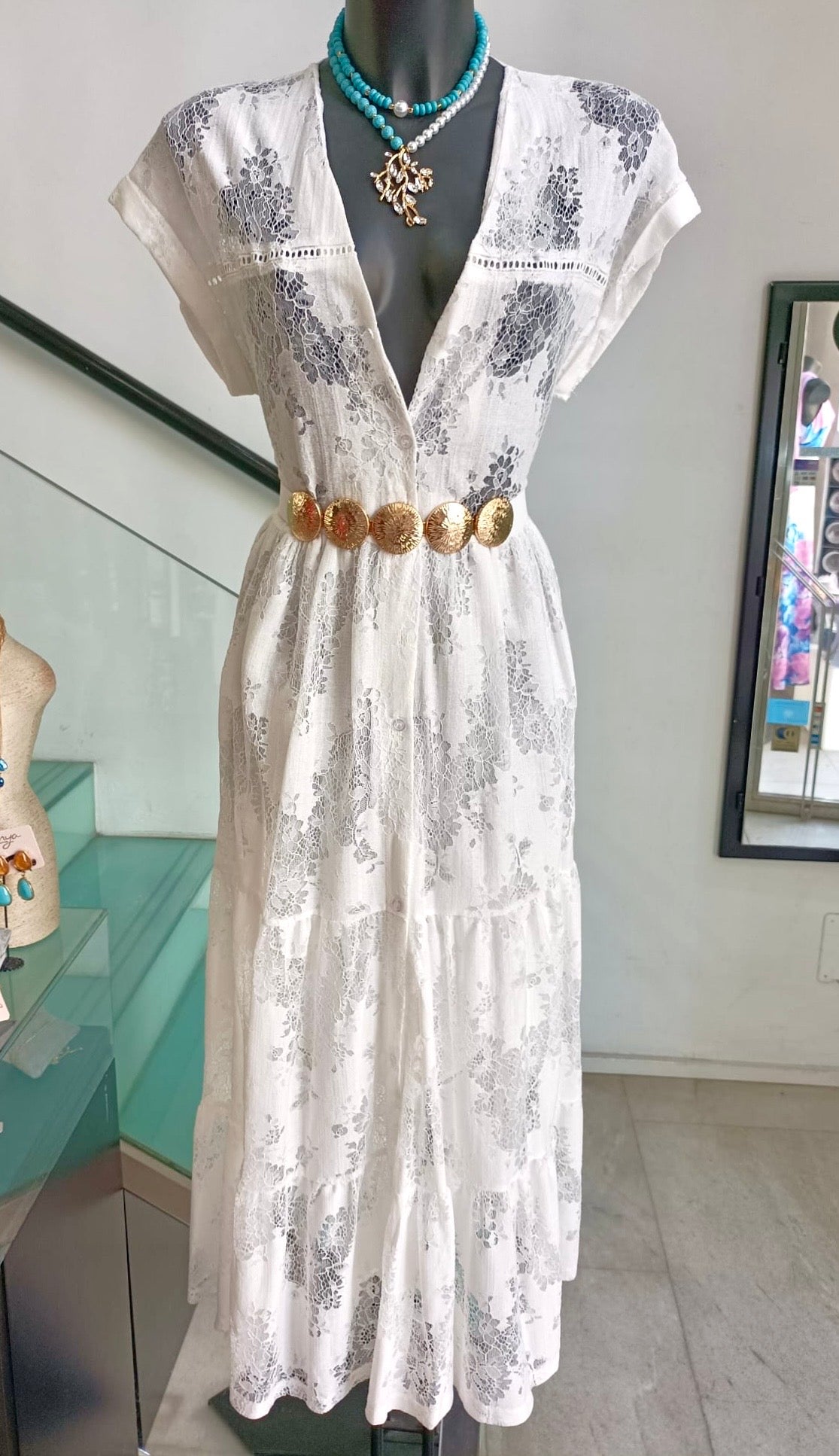 Questo abito della linea Akè, realizzato in un misto di cotone e nylon, unisce freschezza e struttura in un equilibrio raffinato e leggero. Il tessuto, prevalentemente bianco con delicati motivi floreali grigi, dona un effetto romantico ma sobrio, perfetto per le giornate estive o le occasioni eleganti dal tono naturale. Il profondo scollo a V, abbinato alle maniche corte e al taglio morbido, esalta la figura senza costringerla, mentre la cintura dorata a medaglioni accentua il punto vita con un tocco di carattere e stile. Il cotone conferisce comfort e traspirabilità, mentre il nylon aggiunge resistenza e definizione alla forma dell’abito, permettendogli di mantenere la sua linea anche dopo numerosi utilizzi. Questo capo è un esempio perfetto di come materiali classici e dettagli moderni possano fondersi per creare un look senza tempo, adatto tanto a un contesto urbano quanto a un’atmosfera vacanziera.