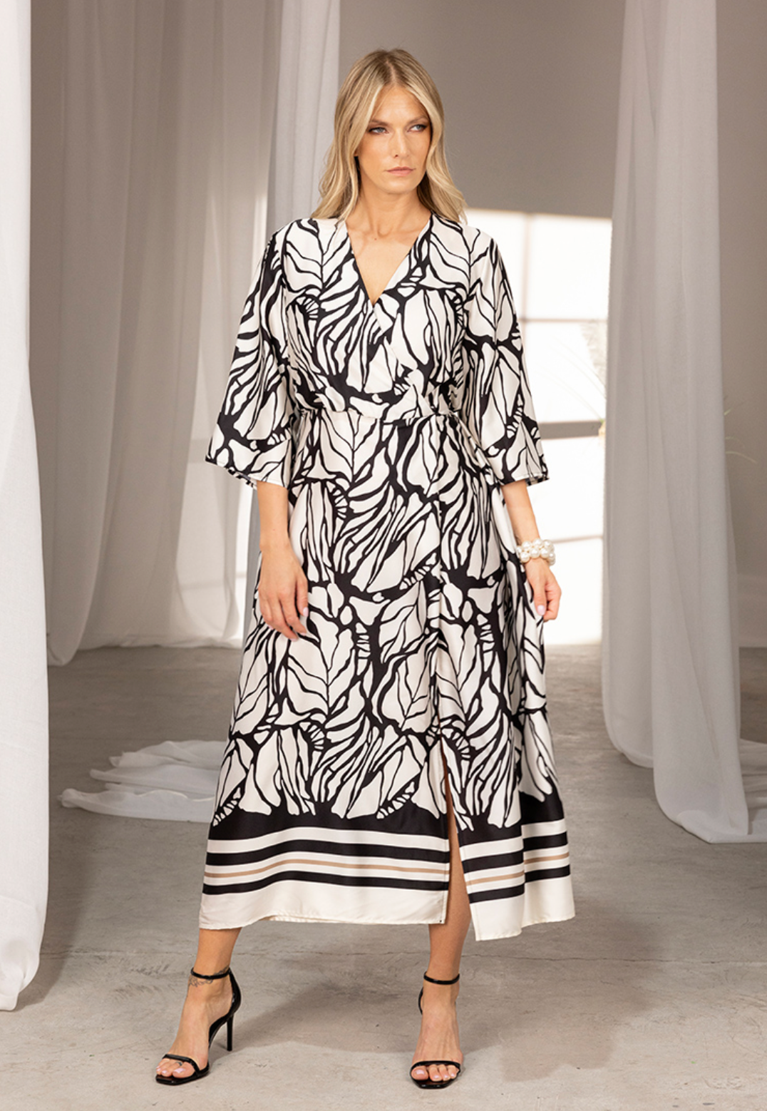 Questo abito lungo ed elegante è caratterizzato da un raffinato motivo astratto in bianco e nero, che crea un effetto visivo sofisticato e moderno. Il modello presenta uno scollo a V incrociato, che valorizza il decolletè e maniche ampie a tre quarti, che donano un tocco di leggerezza e fluidità. La cintura invita esalta la silhouette, mentre lo spacco frontale aggiunge un tocco di sensualità senza perdere l'eleganza complessiva. La stampa ricorda le linee organiche della natura, rendendolo un capo perfetto per ogni evento.