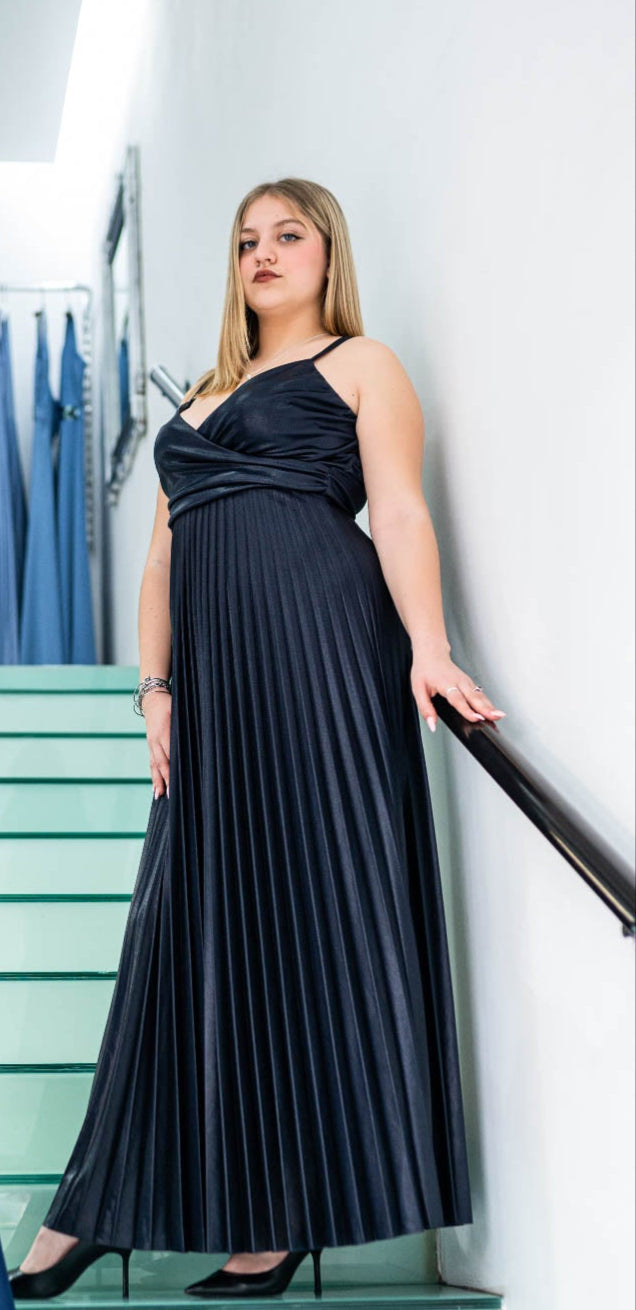 L'abito è un elegante vestito lungo di colore nero. Il modello è caratterizzato da un design con spalline sottili, che aggiunge un tocco sofisticato e raffinato. Il tessuto è leggero e plissettato, creando un effetto fluido e dinamico mentre cade fino ai piedi. La vita è ben definita, evidenziando la silhouette. Il look è completato da scarpe nere a punta, che si abbinano perfettamente allo stile dell’abito, donando un’aria chic e formale.