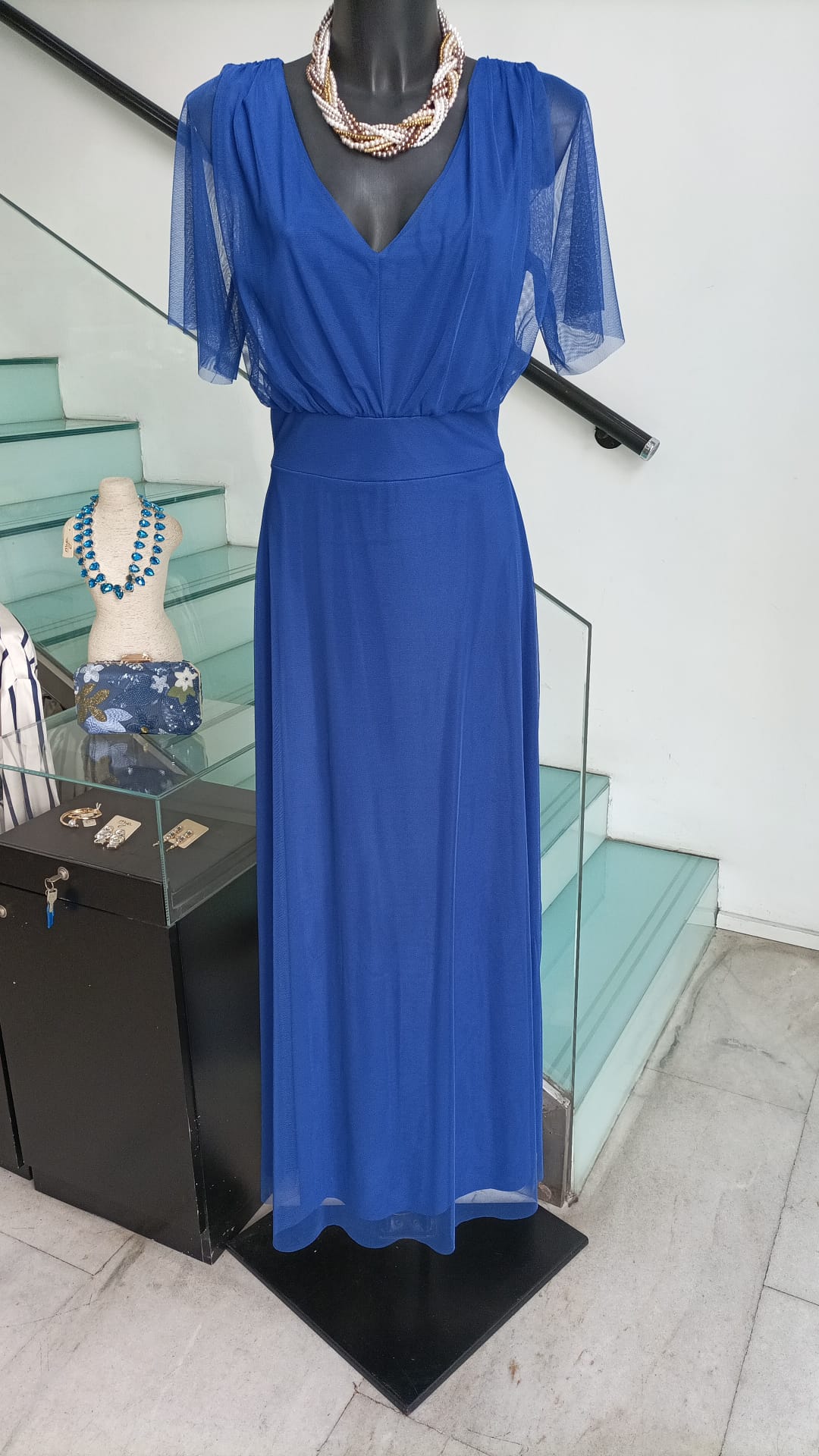 L'abito è elegante con la variazione del verde acqua o del blu, viene caratterizzato da un delicato tessuto plissettato che dona leggerezza e movimento. Ha uno scollo a V incrociato che valorizza il decolletè, le maniche sono corte in chiffon trasparente, che aggiungono un tocco romantico e sofisticato. La vita è segnata per esaltare la silhouettes, mentre la gonna è fluida e cade fino ai piedi rendendo perfetto questo abito per ogni tipo di occasione!