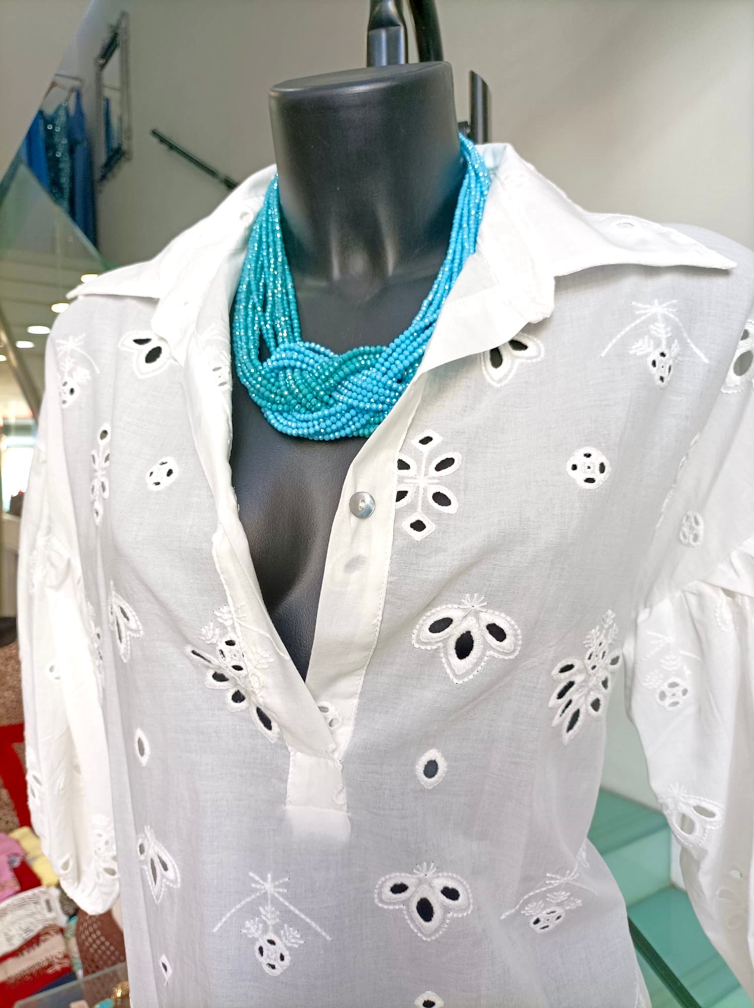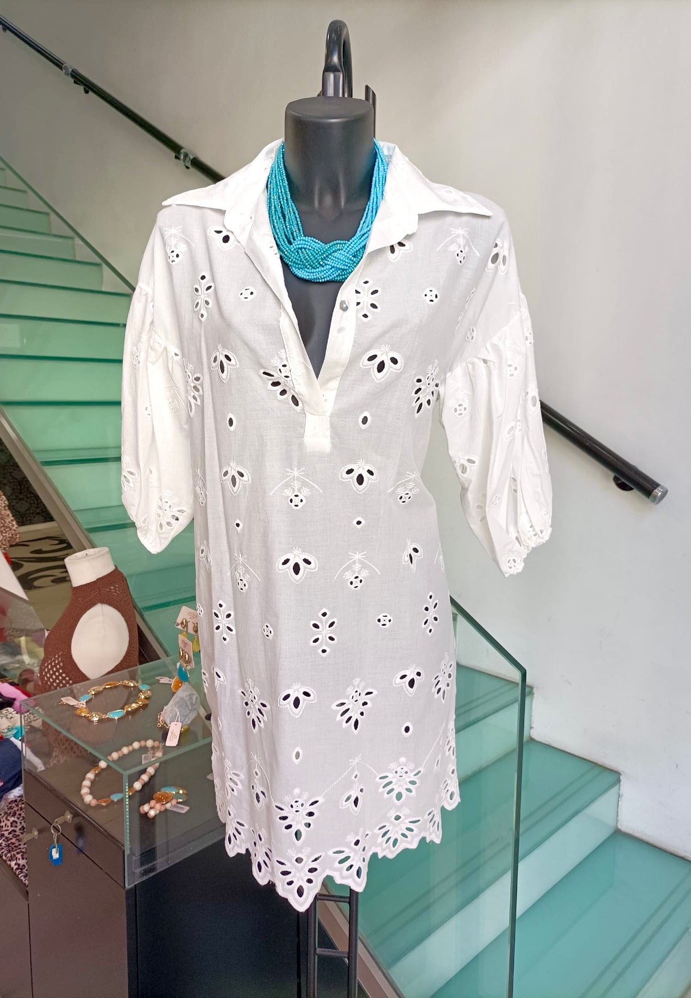 Questo abito della linea Operà, lungo in cotone e nylon è un’elegante fusione di stile boho e raffinatezza mediterranea. Il tessuto leggero, impreziosito da un delicato motivo floreale in tonalità grigie, conferisce un senso di freschezza e leggerezza, ideale per la stagione estiva. Lo scollo profondo a V slancia la figura con naturalezza, mentre le maniche corte leggermente scese aggiungono un tocco rilassato e femminile. La linea è morbida e fluida, con una gonna ampia a balze che accompagna i movimenti con leggerezza. A definire la silhouette, una cintura dorata composta da grandi medaglioni decorati, che dona carattere e illumina l’intero look. È un abito che sa essere al tempo stesso semplice e ricercato, perfetto per una passeggiata sul lungomare o un evento all’aperto al tramonto.