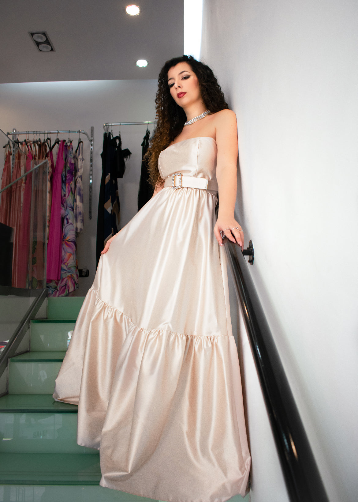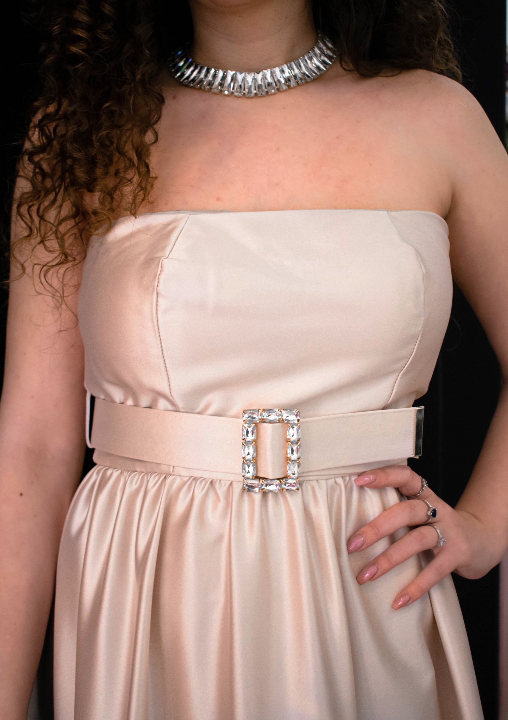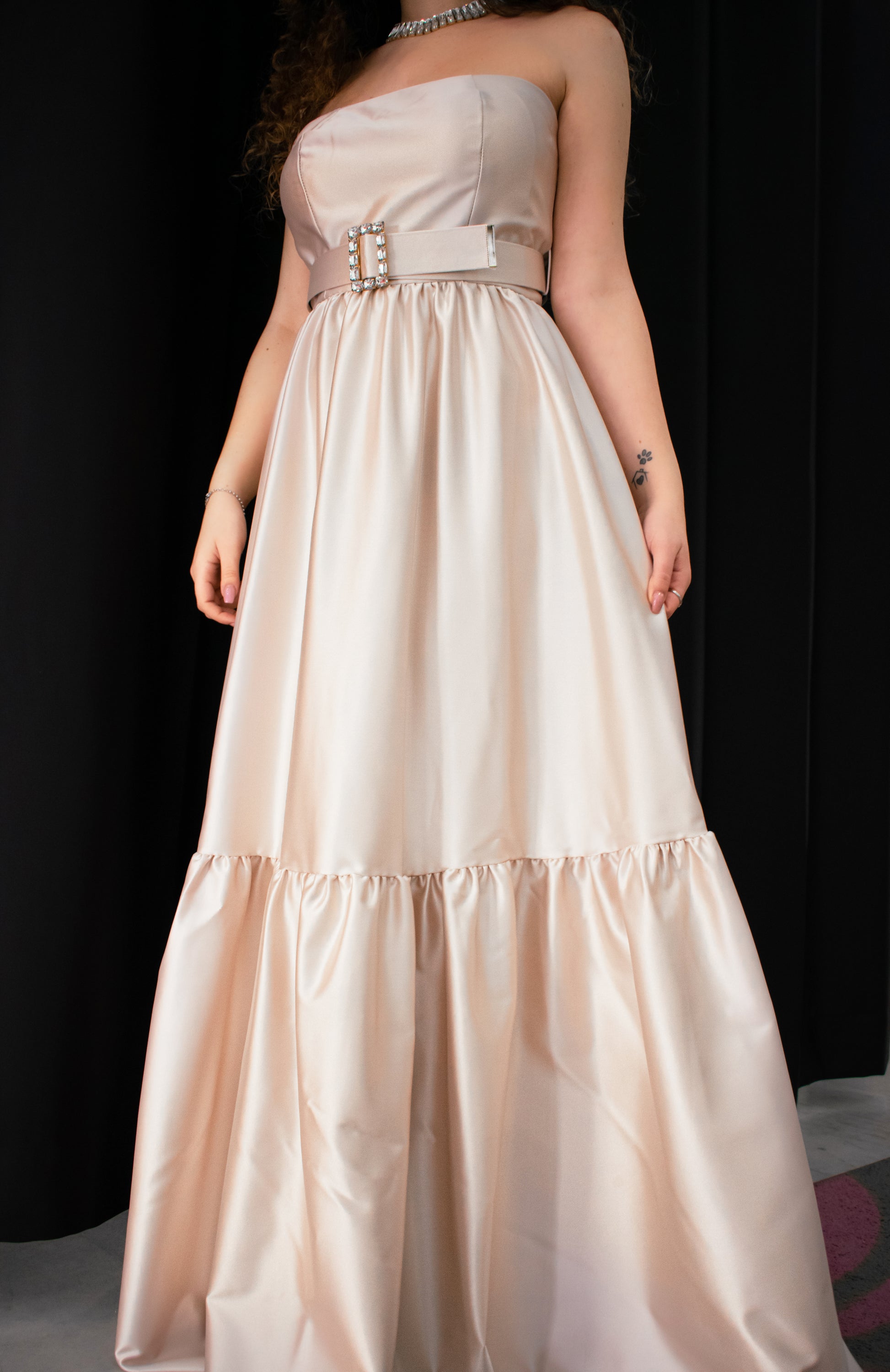 Questo abito è raffinato e versatile, caratterizzato da un corpetto senza spalline in tessuto satinato color champagne che esalta la silhouette con un effetto elegante e sensuale. La vita è sottolineata da una cintura con fibbia, aggiungendo un tocco di sofisticatezza. La gonna lunga e fluida dona movimento e grazia all'insieme. L'outfit ha un'eleganza moderna e chic, perfetto per ogni tipo di occasione!