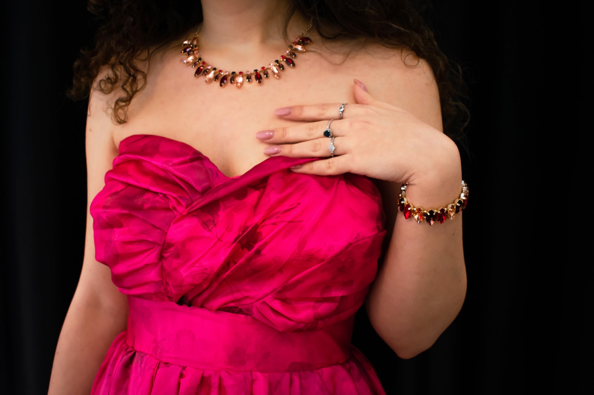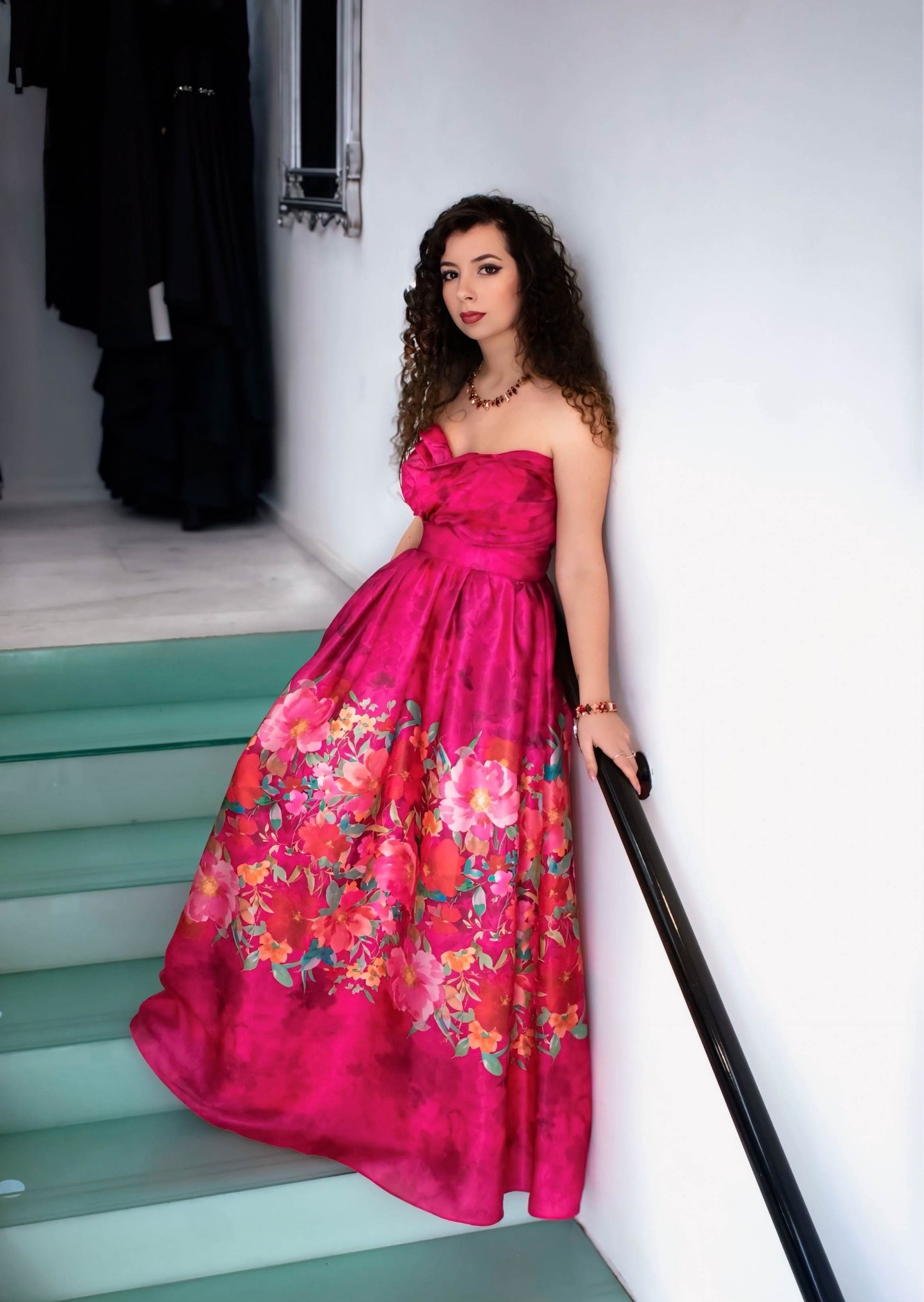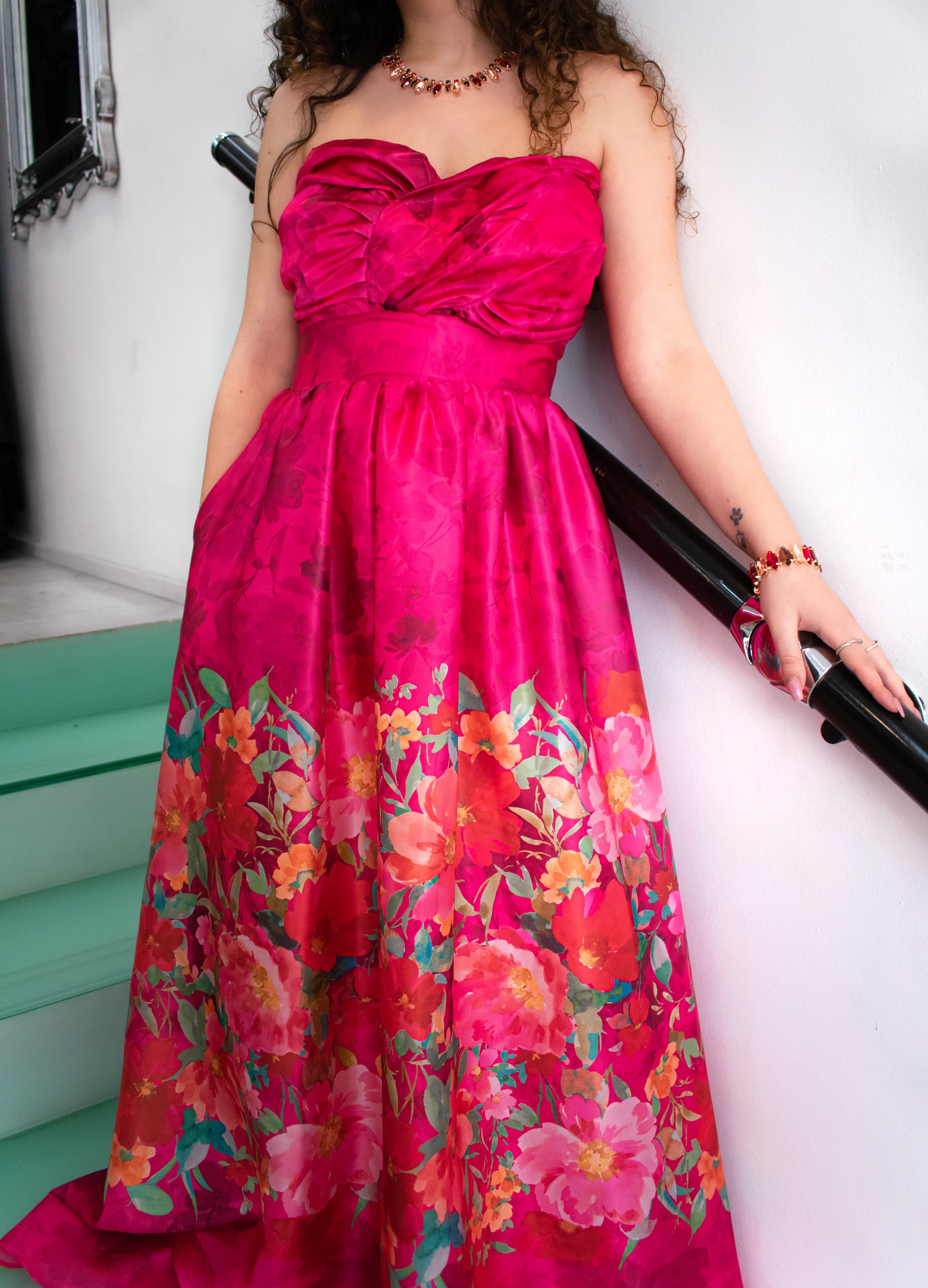Questo abito da sera è un'elegante creazione senza spalline in una vibrante tonalità di rosso con dettagli floreali dipinti a mano nella parte inferiore della gonna. Il bustier strutturato presenta un delicato drappeggio che esalta il décolleté, mentre la gonna ampia e voluminosa dona regalità e movimento. Ideale per ogni occasione!