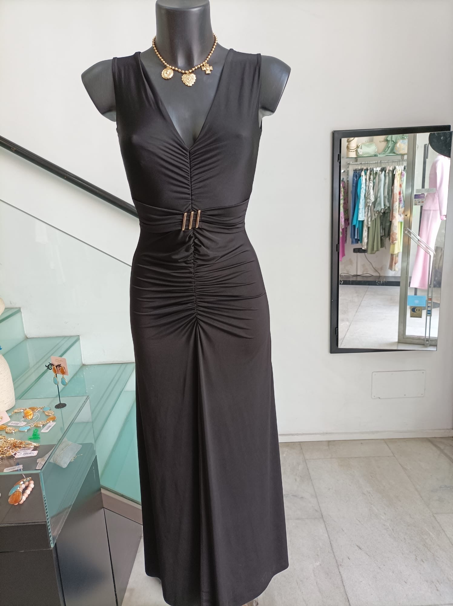 Abito lungo ed elegante di colore nero della linea Operà, ideale per ogni occasione raffinata!