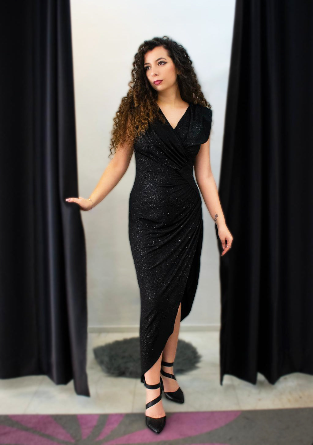 L'abito è elegante e sofisticato, di colore nero con un tessuto leggermente scintillante che dona un effetto luminoso. Presenta una scollatura a V drappeggiata, che crea un effetto avvolgente sul busto, e delle spalline strutturate che aggiungono carattere al design. Il vestito è aderente e segue la silhouette, con un arricciamento strategico sulla vita e sui fianchi, che esalta la figura. La gonna ha un taglio asimmetrico con uno spacco frontale che aggiunge un tocco sensuale ed elegante.