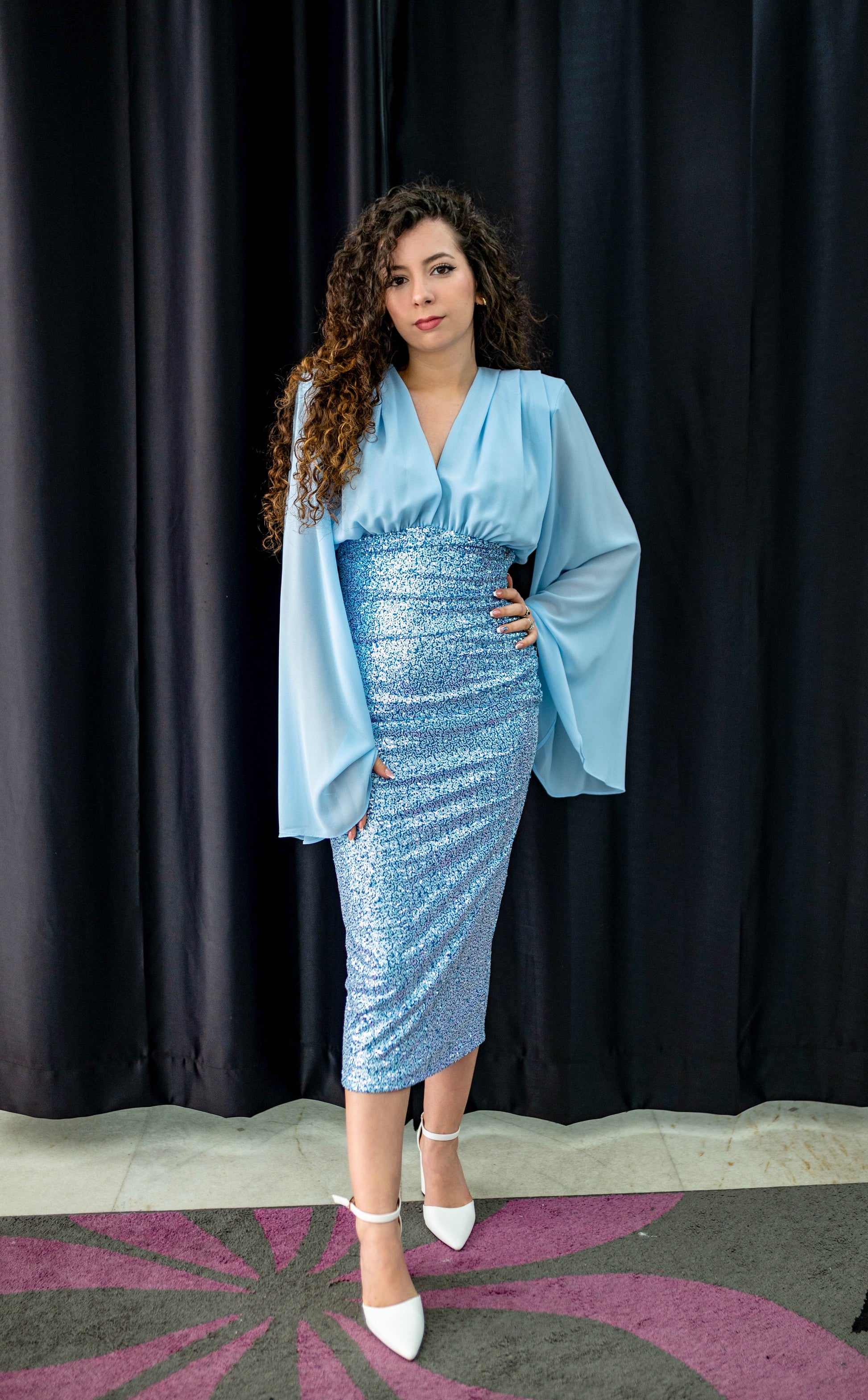 L’abito è un’elegante combinazione di due tessuti e texture: la parte superiore è in chiffon celeste con un design morbido e fluido, caratterizzato da ampie maniche a pipistrello e uno scollo a V delicato, che dona leggerezza e femminilità. La gonna è aderente e avvolgente, completamente ricoperta di paillettes azzurre che catturano la luce e aggiungono un effetto scintillante. La fascia alta in paillettes segna il punto vita, creando un contrasto armonioso tra la fluidità del top e la struttura della gonna.