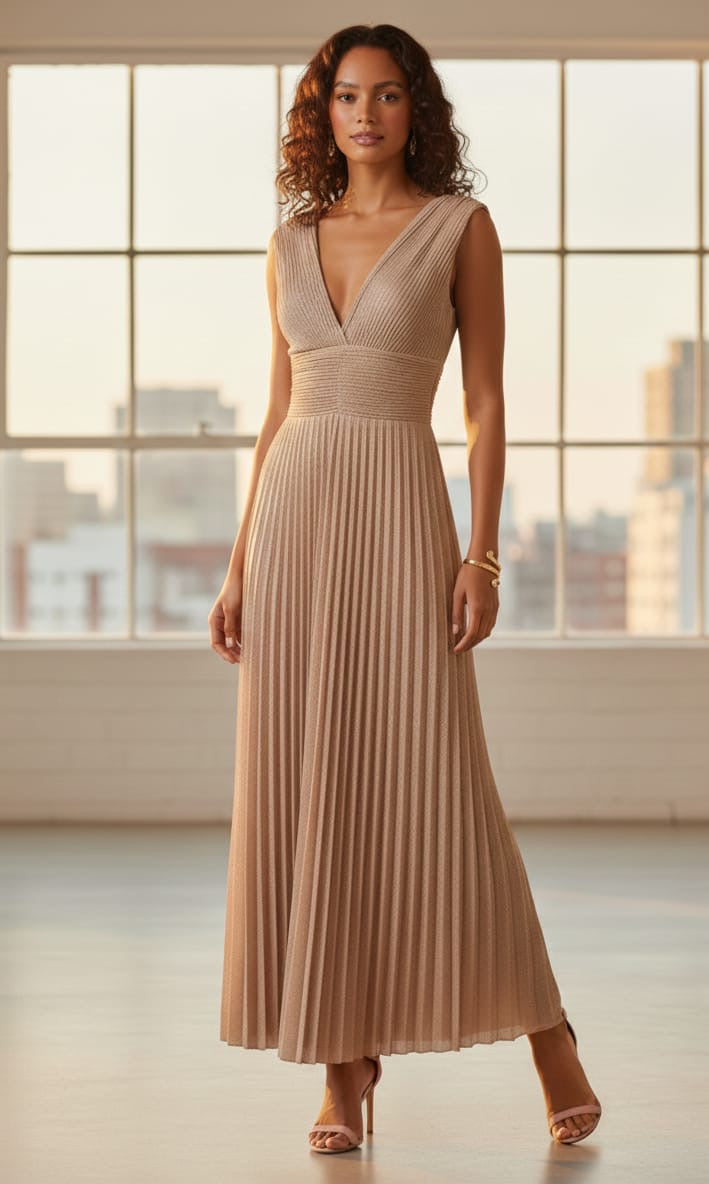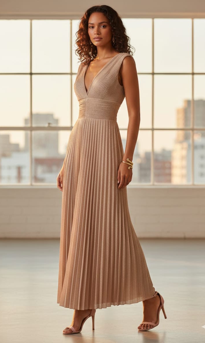 Scopri la raffinatezza dell'Abito Nora! Questo maxi abito plissettato rosa in lurex è l'ideale per chi desidera farsi notare con grazia. La sua fluidità e luminosità aggiungono un tocco di eleganza ad ogni occasione. Indossalo e lascia che il tuo stile parli per te!