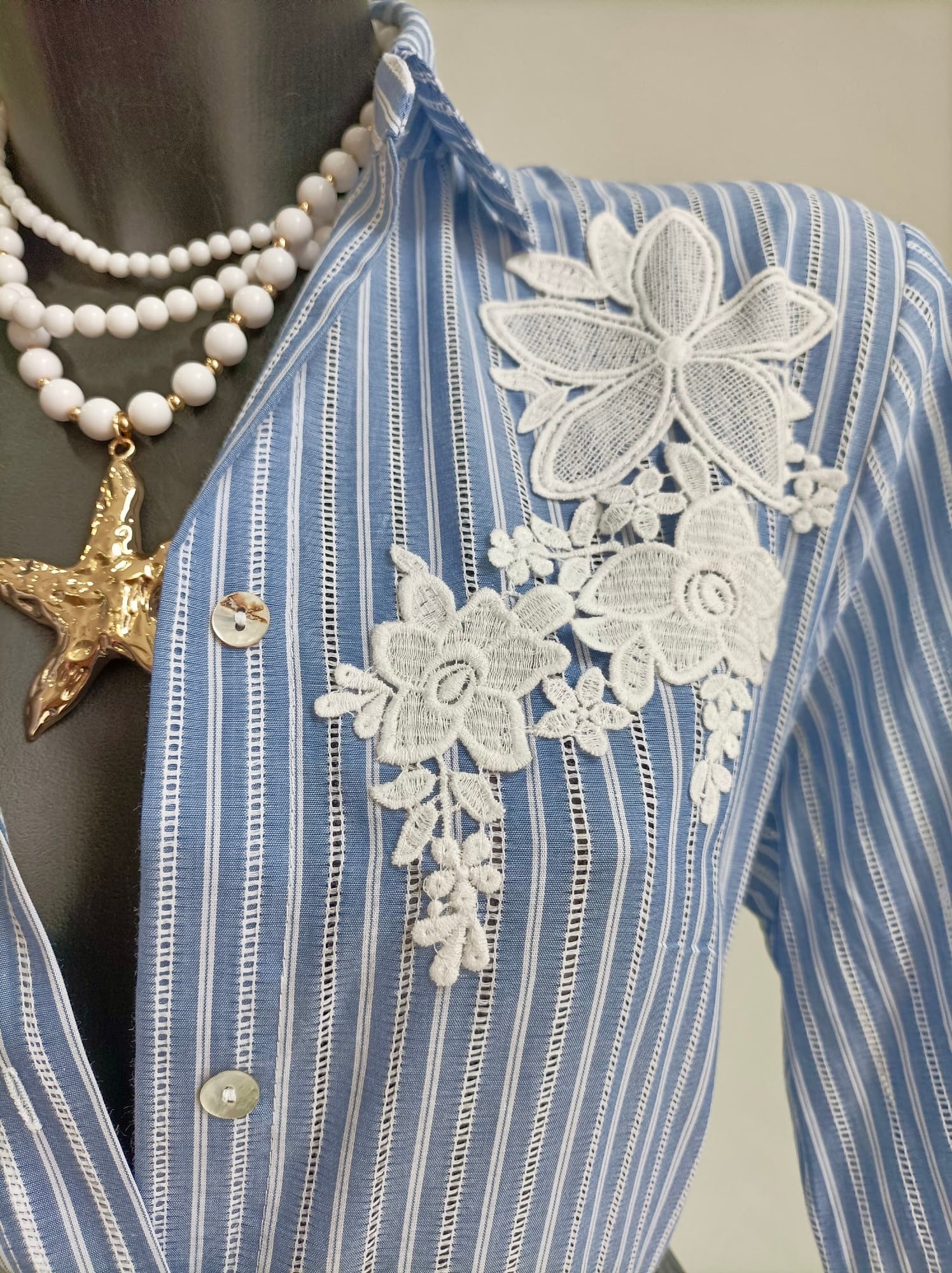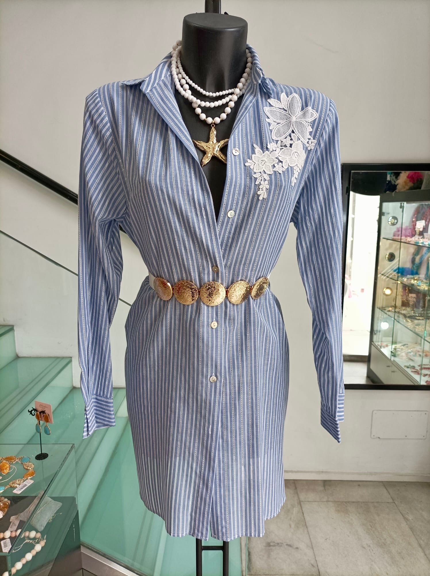 Sul petto, a destra, è applicato un elegante dettaglio floreale in pizzo bianco che aggiunge un tocco romantico e femminile. La vita è evidenziata da una cintura dorata composta da grandi dischi decorativi in stile marino, che si abbina perfettamente alla collana con perle bianche e una vistosa stella marina dorata che trovi nel nostro Catalogo nella sezione Collane
