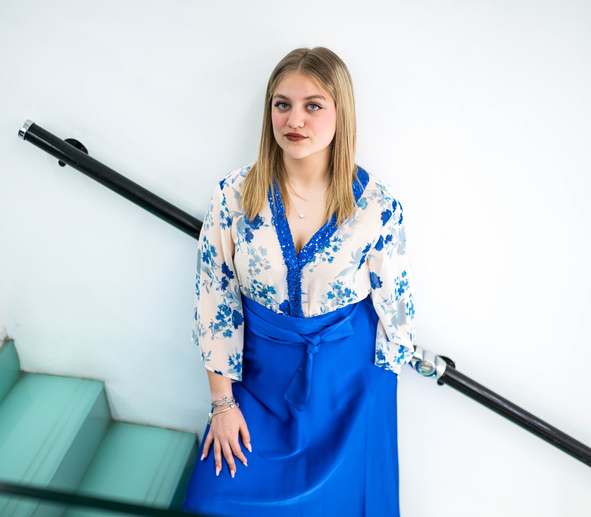 La blusa è a fantasia floreale nei toni del blu e del bianco, con scollatura a V decorata da una raffinata bordatura di paillettes blu che aggiunge luminosità al look. Le maniche sono lunghe e morbide, conferendo un tocco romantico e sofisticato.