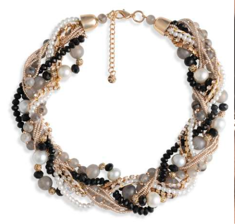 Collana girocollo con pietre in acrilico e vetro intrecciato, tono bianco e nero-turchese