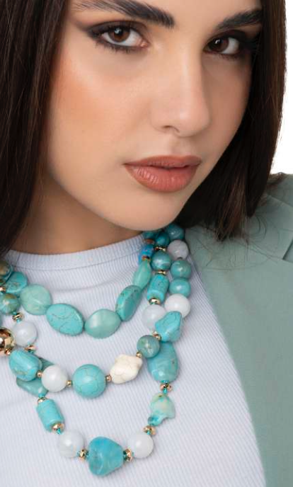 Collana a tre fili con mix di pietre dure ed acrilico tono turchese