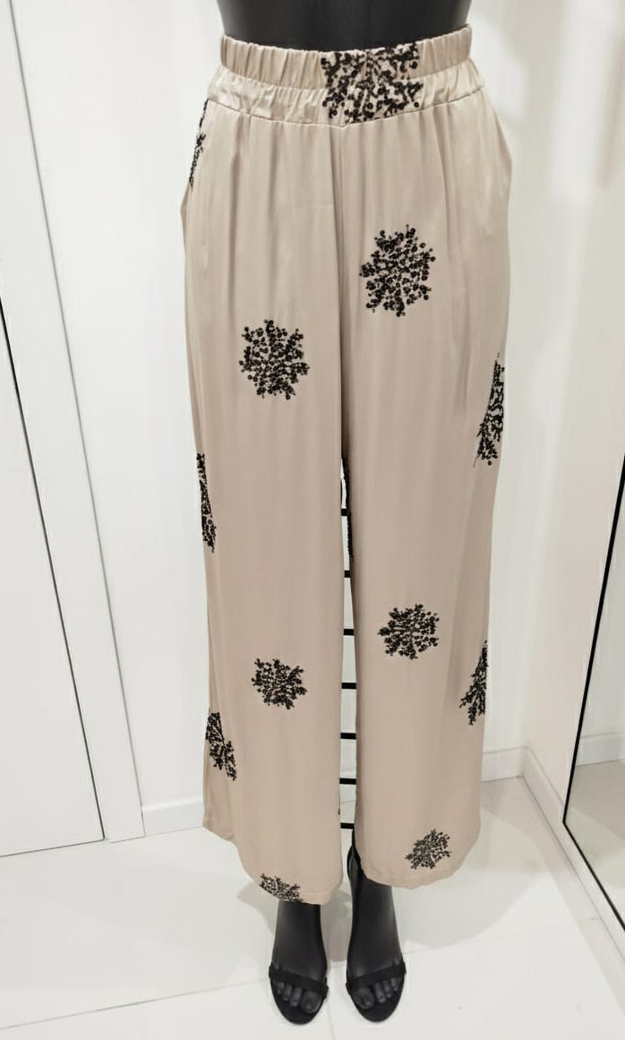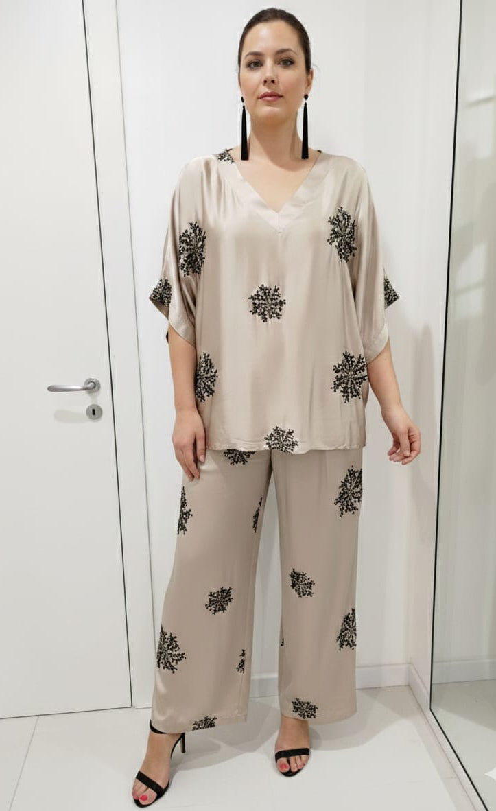Esprimi la tua unicità con il Completo Eva Curvy! Realizzato in morbida viscosa, questo outfit è decorato con eleganti paillettes che catturano la luce. Il pantalone con elastico in vita offre comfort e stile, permettendoti di muoverti con grazia e sicurezza in ogni occasione. Fatti notare!