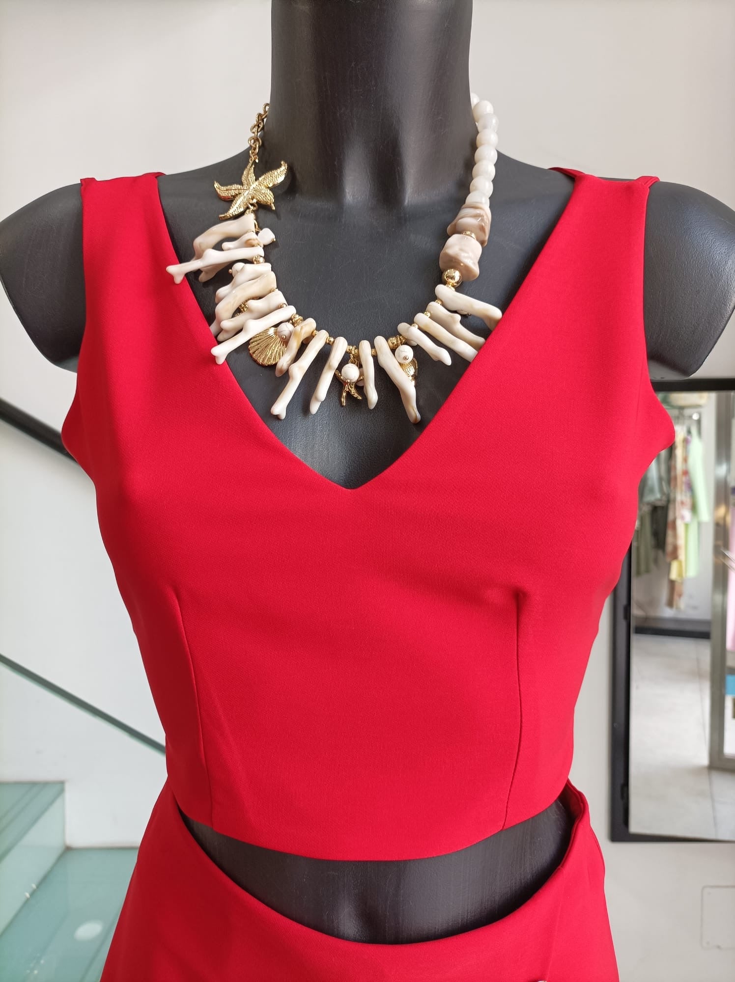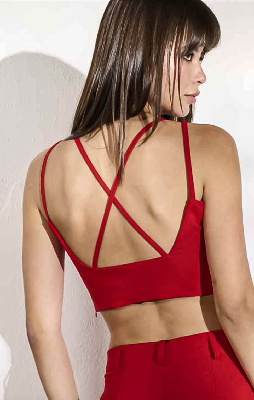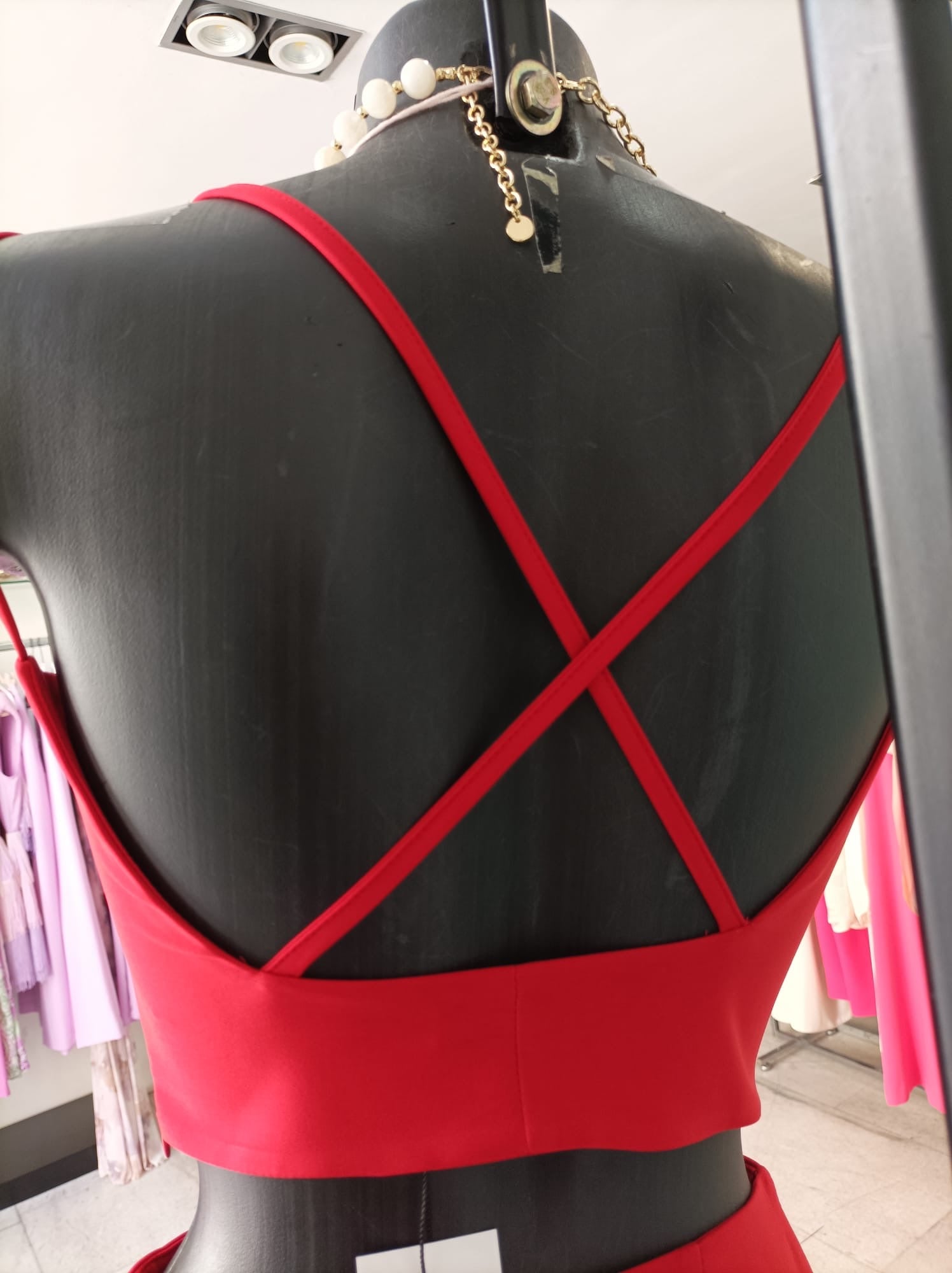 Il top rosso nella foto è un modello crop dal design moderno ed essenziale. Ha uno scollo a V sul davanti, con una silhouette aderente che esalta la figura. La particolarità del capo è la parte posteriore, caratterizzata da sottili spalline che si incrociano sulla schiena, creando un effetto dinamico ed elegante.