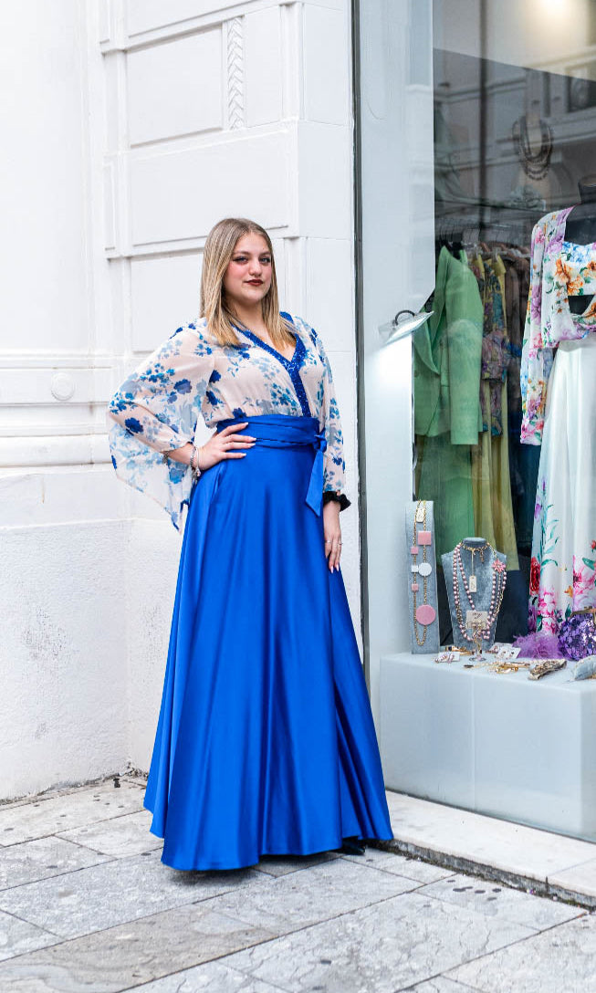 La gonna lunga è di colore blu acceso, caratterizzata da un ampio fiocco in vita che sottolinea la silhouette con grazia. L’insieme crea un equilibrio tra raffinatezza e freschezza, perfetto per un’occasione speciale o una cerimonia.