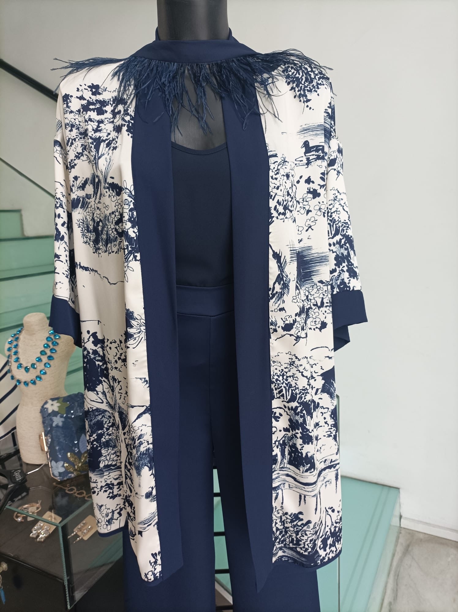 Questo raffinato kimono si ispira all'eleganza giapponese utilizzando una stampa paesaggistica giapponese dai toni del blu sul fondo chiaro. I dettagli sono in tinta unita blu scuro sulle maniche e sul bordo donando contrasto e profondità. Perfetto per un look elegante e sofisticato.