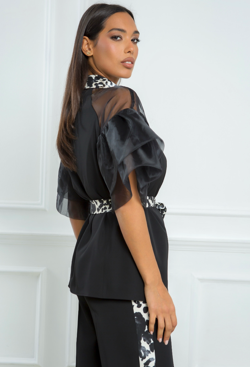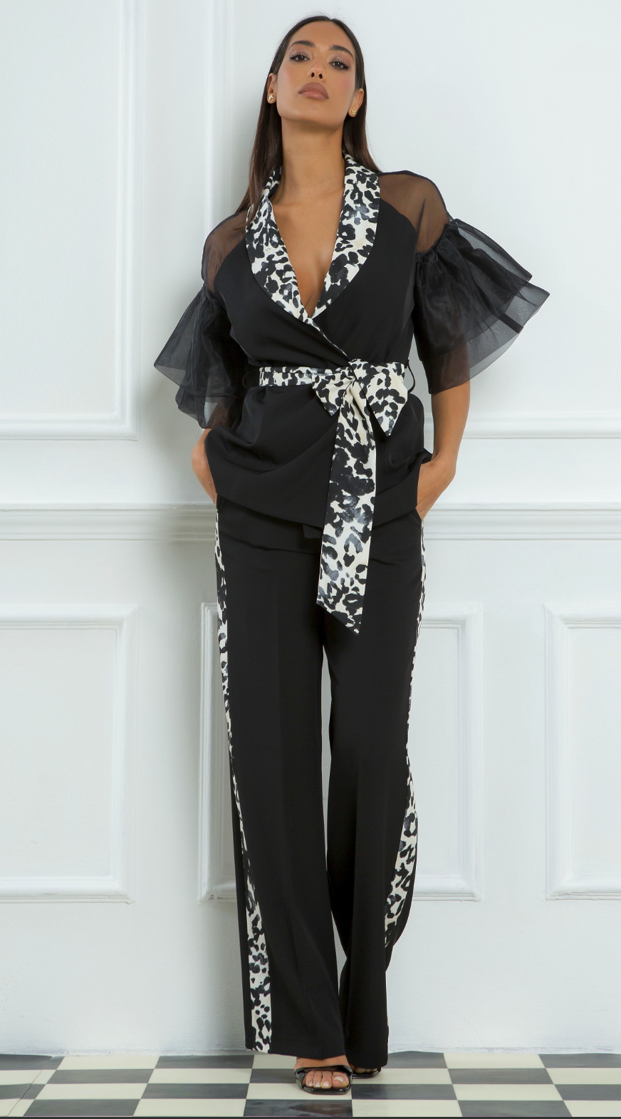 Il pantalone è nero, ampio e dal taglio dritto, caratterizzato da dettagli in fantasia animalier lungo i lati, che richiamano la cintura e il colletto della giacca. Il tessuto fluido dona movimento ed eleganza, rendendolo perfetto per un look sofisticato e contemporaneo. La lunghezza copre quasi interamente le scarpe, slanciando la figura.
