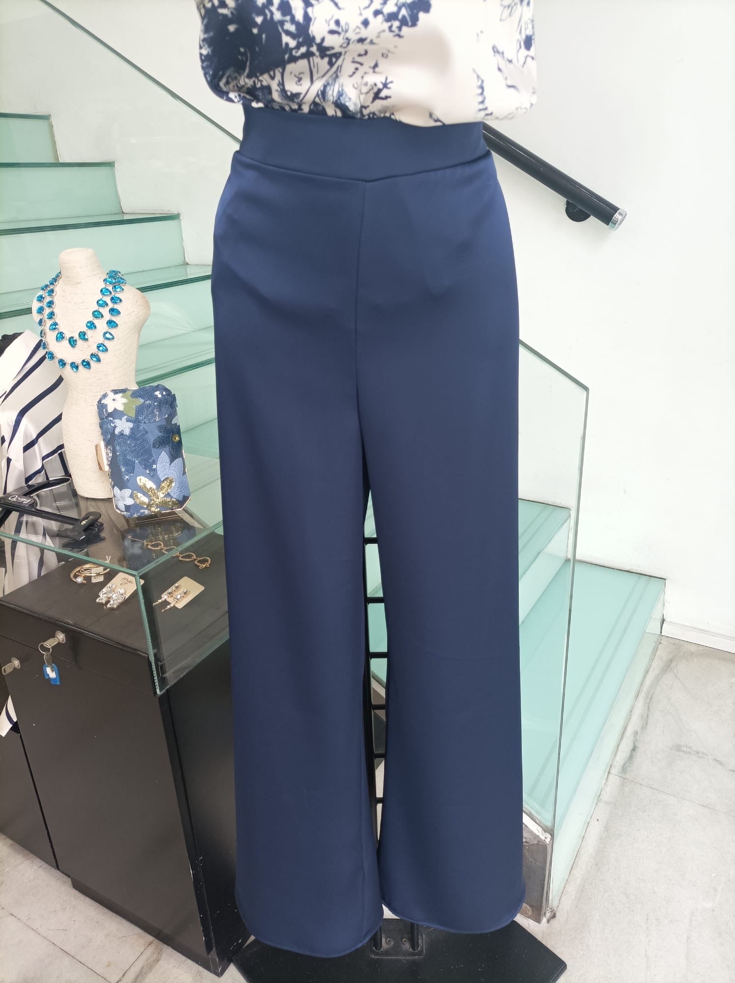 Questo pantalone elegante e versatile, è caratterizzato da un design sofisticato. Di colore blu scuro, una tonalità raffinata e facile da abbinare, ha un taglio a gamba larga e dritta, che dona fluidità e un tocco di eleganza. La vita alta e ben strutturata è perfetta per slanciare la figura, di un tessuto leggero e fluido, è ideale per un look chic e formale ma anche adatto a un outfit più casual. Questo pantalone è perfetto per tutte le occasioni.