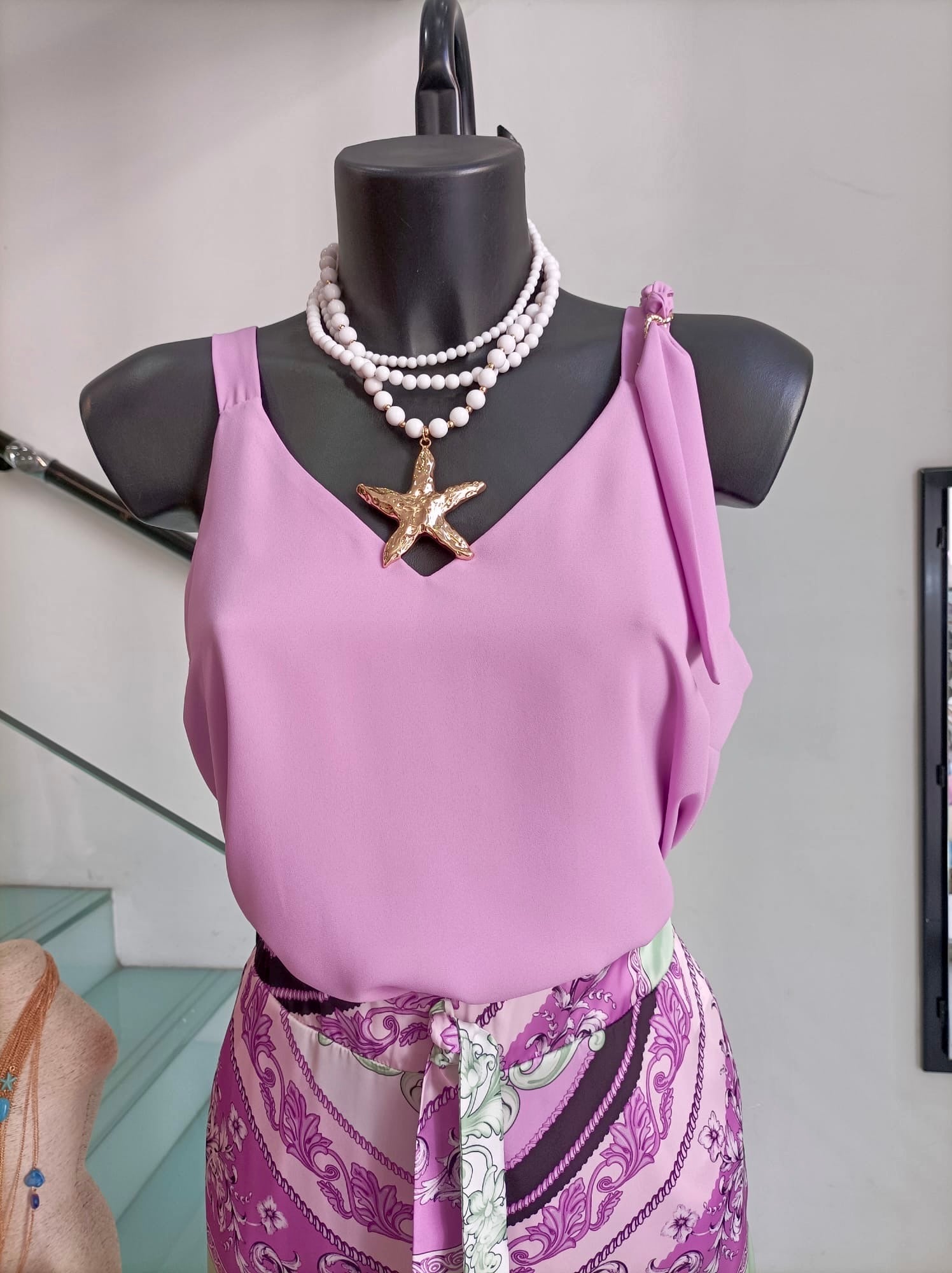 Questo top della linea Akè, elegante con questo scollo a V e con questo colore acceso è perfetto per un outfit mozzafiato!