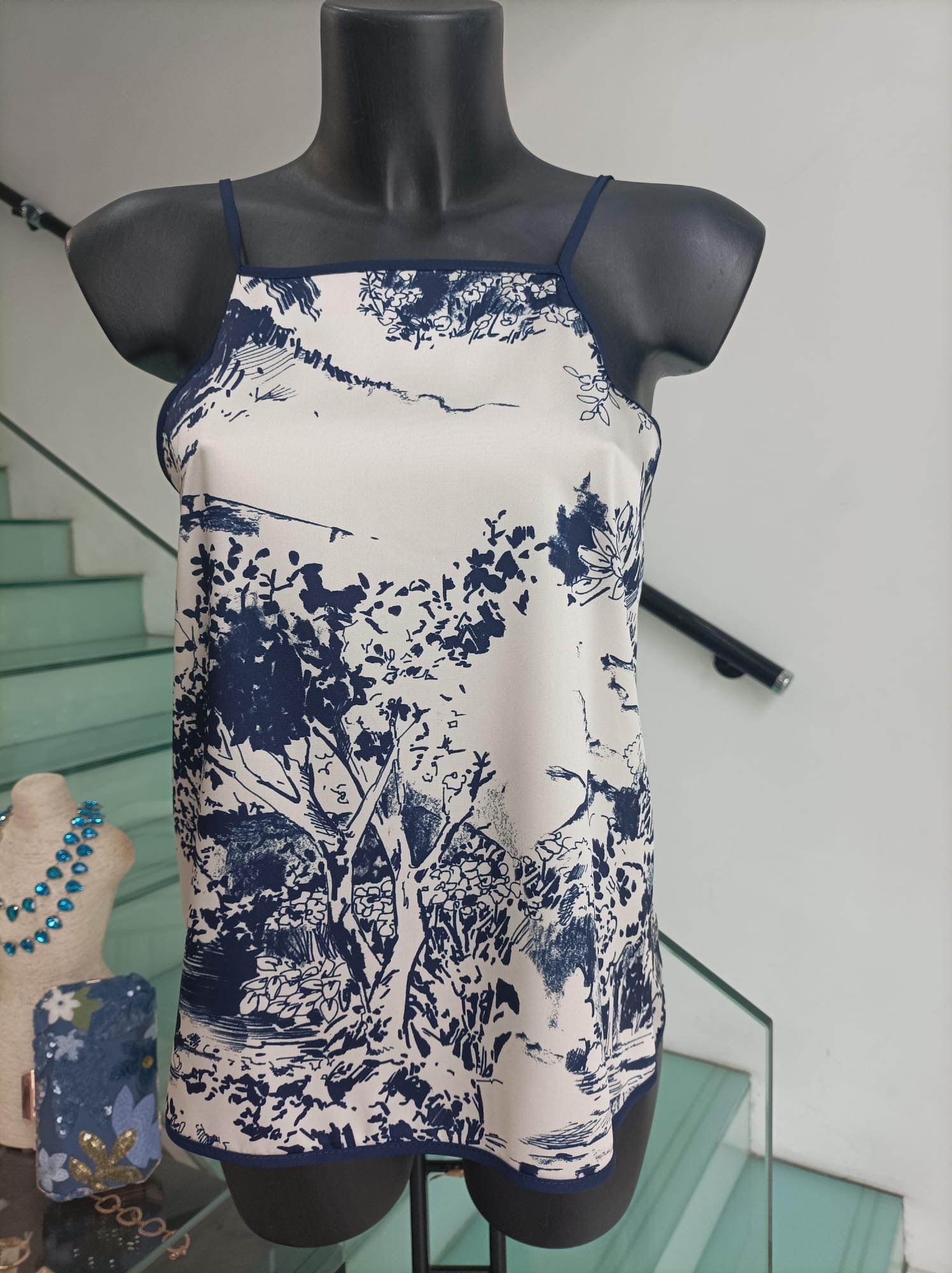 Questo top si ispira all'estetica giapponese, con una stampa delicata che richiama i paesaggi naturali. Le spalline sottili e il taglio fluido donano leggerezza e raffinatezza, rendendolo perfetto per un look sofisticato e armonioso.